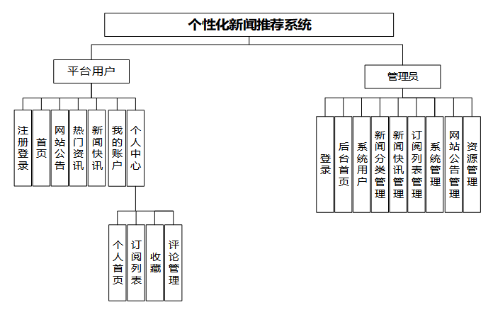 在上一章节中主要对系统的功能性需求和非功能性需求进行分析,并且根据需求分析了本个性化新闻推荐系统中的用例。那么接下来就要开始对本个性化新闻推荐系统的架构、主要功能和数据库开始进行设计。个性化新闻推荐系统根据前面章节的需求分析得出,个性化新闻推荐系统的功能模块图如下图所示。