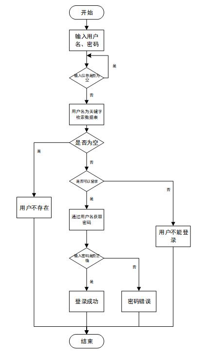 用户输入用户名和密码后,系统先检查输入是否为空,再验证用户名是否存在,若存在则通过用户名获取密码并校验。若密码正确则登录成功,否则提示密码错误。若用户名不存在或无法登录,提示用户操作无效。如下图所示。