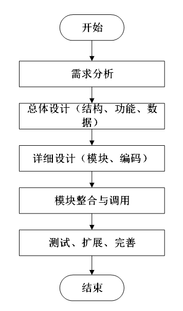 系统开发流程的主要步骤,从需求分析到系统完成的全过程。流程包括需求分析、总体设计(结构、功能、数据)、详细设计(模块、编码)、模块整合与调用,以及测试、扩展和完善,最终完成系统的开发。本系统的开发流程如下图所示
