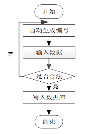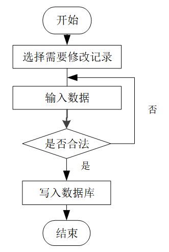 用户首先选择需要修改的记录,输入修改后的数据,系统判断输入数据是否合法。若数据不合法,提示重新输入,若数据合法,则将修改后的数据写入数据库,完成操作后流程结束。修改信息流程图如下图所示。