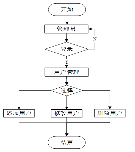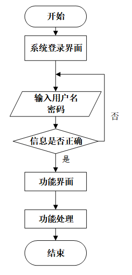 用户首先进入系统登录界面,输入用户名和密码后,系统验证信息是否正确。若验证失败,返回登录界面重新输入,若验证成功,则进入功能界面,执行相应功能处理后结束操作流程。操作流程如下图所示。