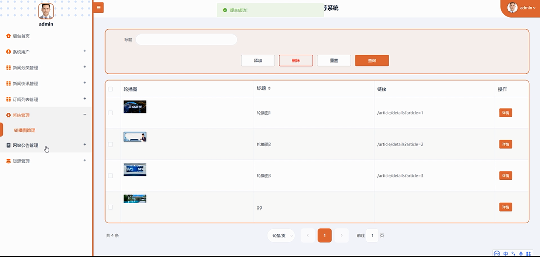 系统管理:在系统管理部分,管理员可以查询、删除和添加轮播图资源。轮播图通常用于展示平台的重点内容或广告,管理员通过此功能来调整首页展示内容,提升平台的宣传效果。
