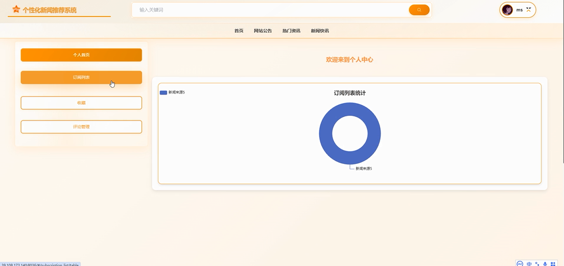 个人中心:个人中心为用户提供了便捷的管理工具,包括个人首页展示、订阅列表和统计图表。用户可以查看订阅列表中的新闻内容,删除不感兴趣的项目,并查看新闻推荐的统计数据。该模块还提供收藏夹和评论管理,帮助用户有效管理自己感兴趣的内容。