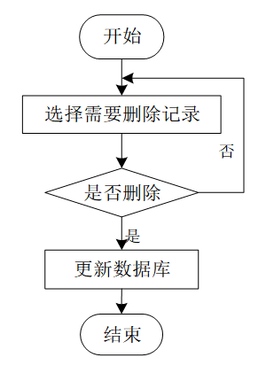 用户选择需要删除的记录后,系统判断是否确认删除。若未确认,返回选择环节,若确认删除,则更新数据库,删除对应记录,完成操作后流程结束。删除信息流程图如下图所示。