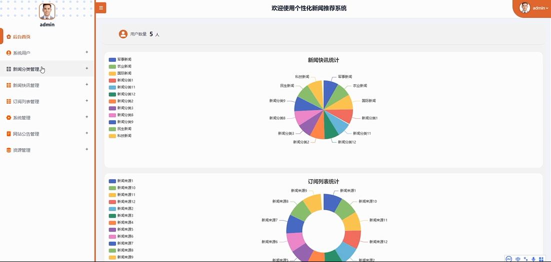 后台首页:后台首页展示了新闻快讯和订阅列表的统计图,提供平台运营状况的概览,帮助管理员实时了解用户关注热点和新闻传播效果。
