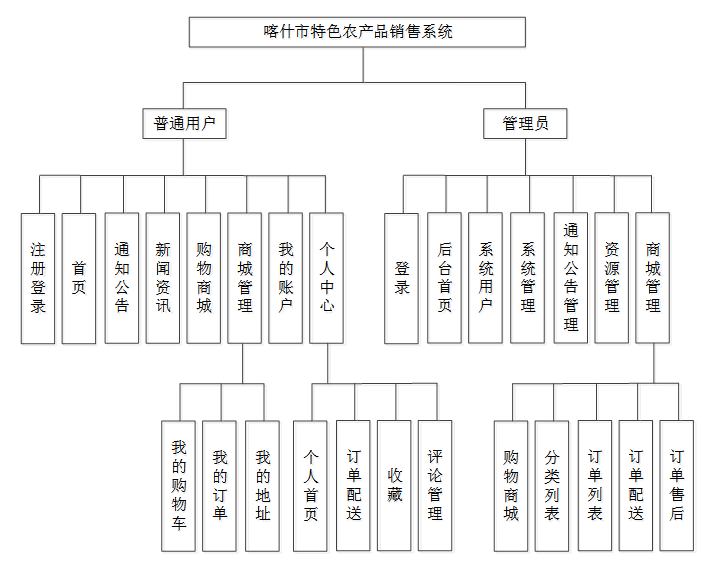 整个喀什市特色农产品销售系统是由多个功能模块组合而成的,根据用户需求分析,本系统主要可以划分为普通用户和管理员等两大模块。各模块又可细分为不同的子功能设计,实现多角色协作,负责不同的职能,每个角色对应的功能模块如图所示。