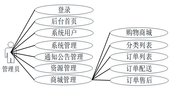 喀什市特色农产品销售系统中管理员则集成了登录、后台首页、系统用户、系统管理、通知公告管理、资源管理、商城管理等功能。管理员用例图如下所示: