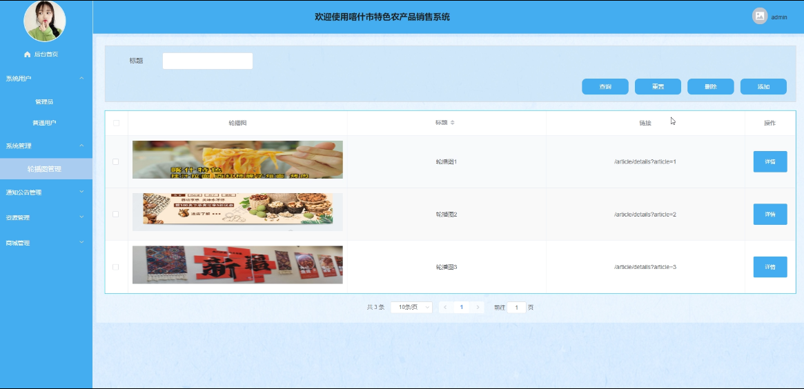 - 系统管理:管理员可管理系统首页的轮播图信息,提供搜索功能,支持上传、删除、更新轮播图内容,可添加图片链接信息。