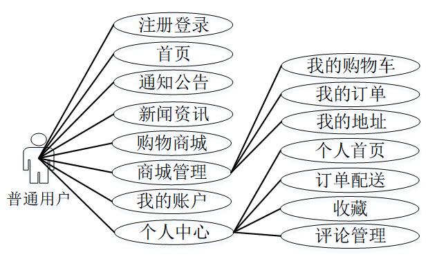 在喀什市特色农产品销售系统中普通用户包含注册登录、首页、通知公告、新闻资讯、购物商城、商城管理、我的账户、个人中心等功能。普通用户用例图如下所示: