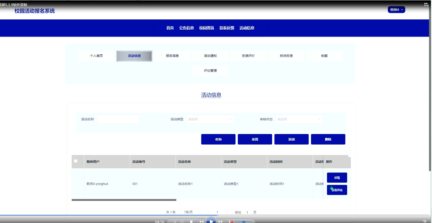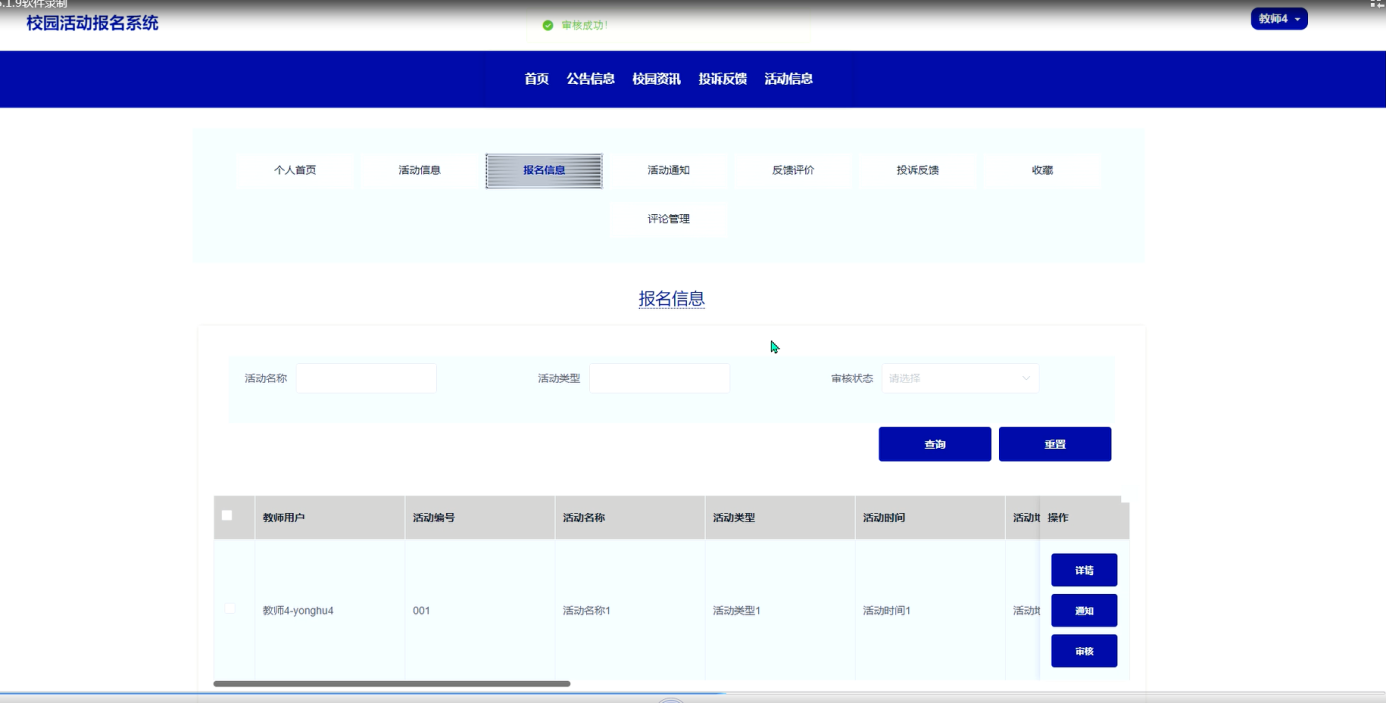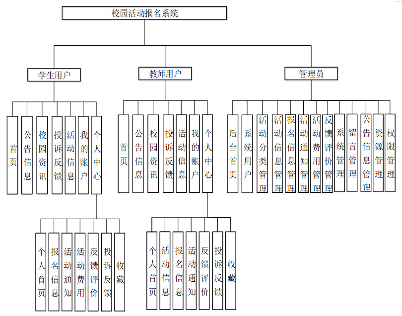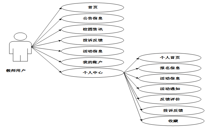 教师用户的功能与学生相似,除了能够查看活动信息、参与活动和查看自己的报名信息外,教师还可查看和管理个人信息、活动通知和活动反馈。同时,教师用户还可以参与反馈和投诉,进行评价,方便自己管理与参与的各类活动。整个系统为不同角色的用户提供了便捷的操作界面和高效的管理功能,优化了校园活动的报名和管理流程。