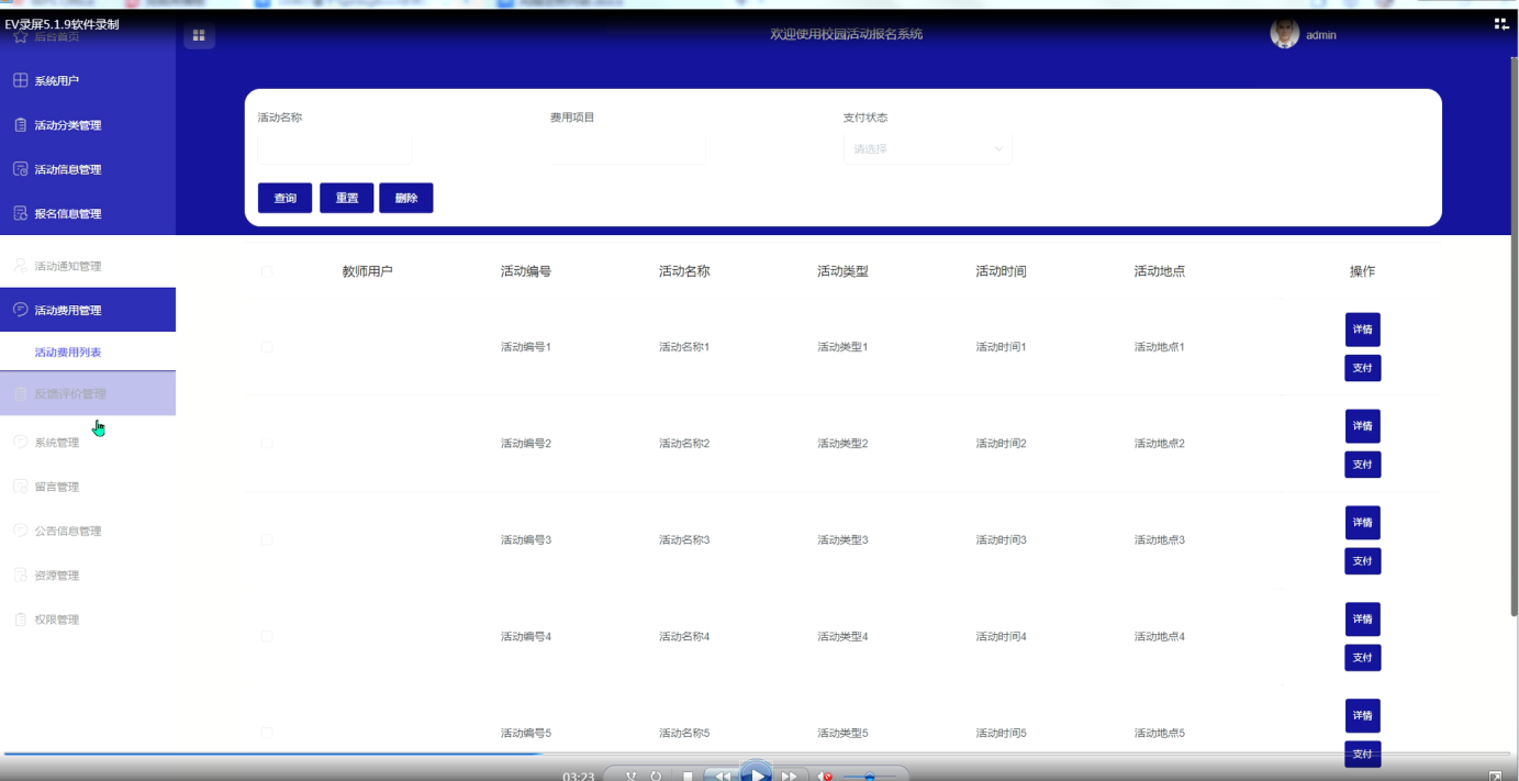 管理员点击“活动费用管理”这一菜单会显示活动费用列表这个子菜单,点击“活动费用列表”可以查看活动费用详情和支付情况,可以进行查询、重置和删除等操作。活动费用管理界面如下图所示。