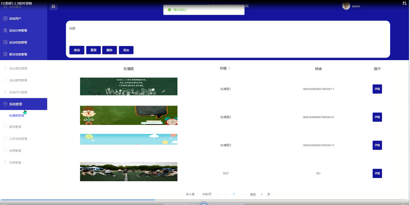 管理员点击“系统管理”菜单,可以对前台展示的轮播图进行设置,系统管理界面如下图所示。