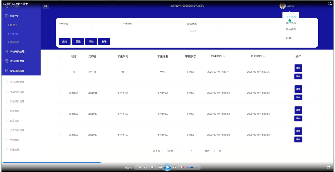 管理员可以通过后台首页查看系统整体信息,并进行系统用户管理、活动分类管理、活动信息管理等操作,确保活动的顺利进行。他们还可以管理报名信息,审核和处理学生的报名数据,同时发布活动通知、公告信息以及管理活动费用,确保费用的透明和合理性。此外,管理员还负责反馈评价的管理、留言管理和系统资源的管理,包括校园资讯和资讯分类,确保系统内容的更新与完善。权限管理功能则保证了系统的安全性和数据的隔离。