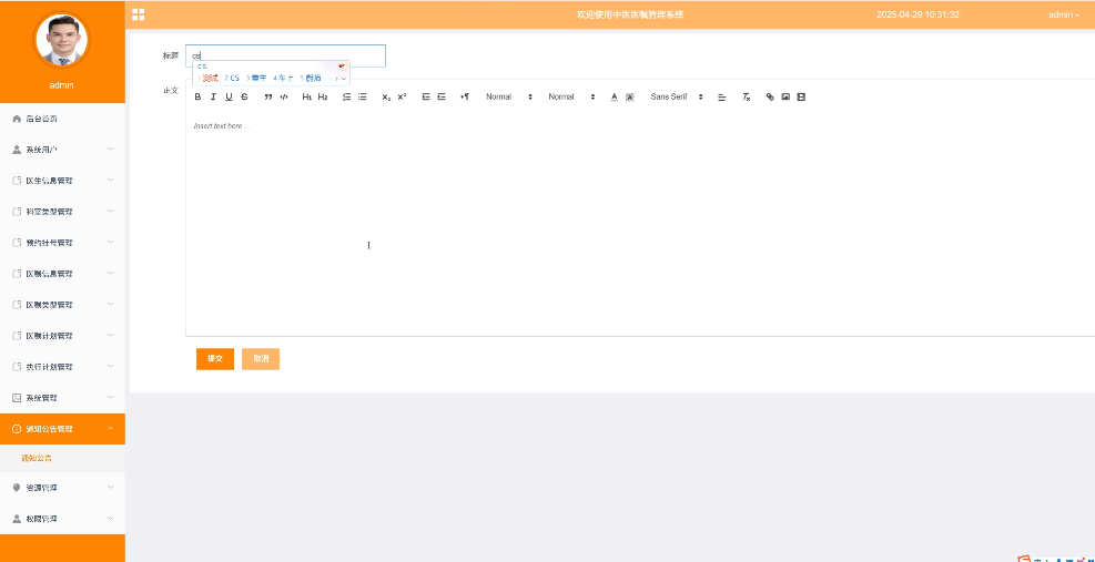 随着医疗信息化的快速发展,传统医嘱管理模式在效率、准确性和协同性方面面临挑战,尤其在中医诊疗场景下,医嘱的复杂性和个性化需求更为突出。为提高医疗服务质量,优化医护协作流程,本文设计并实现了一套基于Spring Boot的中医医嘱管理系统。该系统采用B/S架构,结合Spring Boot、Vue.js和MySQL等技术,实现了多角色协同管理功能,包括管理员的数据统计、用户管理、科室及医嘱类型配置;医生的医嘱制定与审核;护士的医嘱执行与计划管理;以及患者的预约挂号、医嘱查询等功能。系统通过权限控制确保数据安全,利用智能提醒和统计分析优化医嘱执行效率,并引入通知公告模块增强医患沟通。测试结果表明,该系统有效提升了医嘱管理的规范性和实时性,减少了人工操作错误,为中医诊疗信息化提供了可行解决方案。