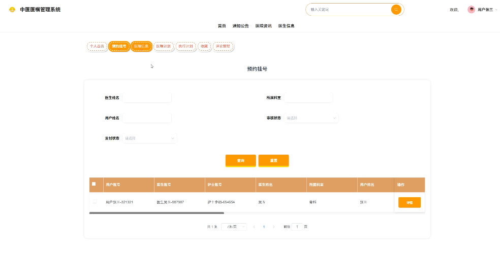 预约挂号:注册用户可选择科室、医生和就诊时间进行挂号预约。