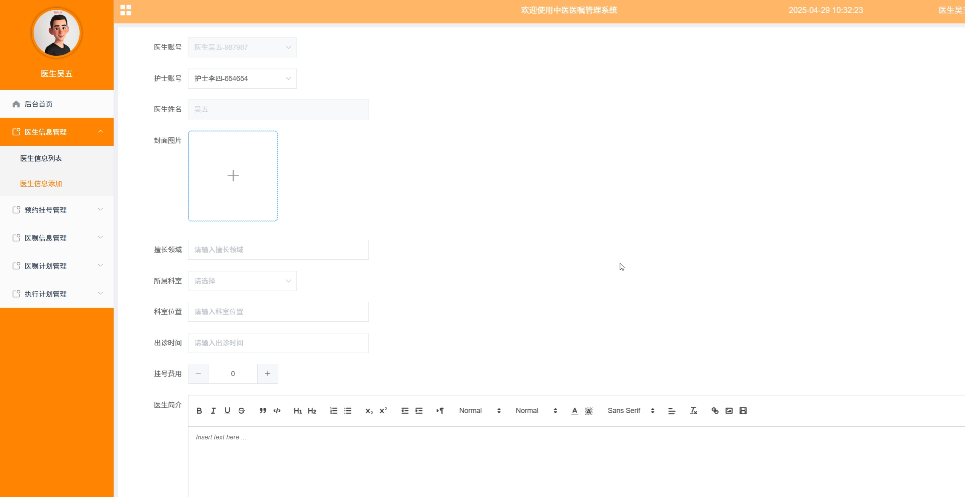 医生信息管理:医生信息管理:用于维护医生基本信息,包括个人资料、专业领域和排班情况等,确保医生信息的准确性和及时更新。