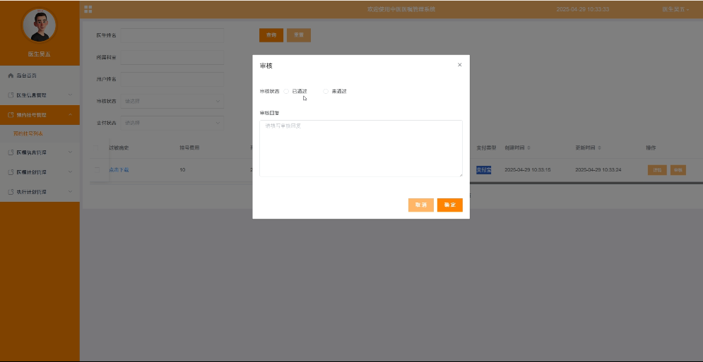 预约挂号管理:医生可处理患者的预约申请,功能包括:查看待审核预约列表。审核患者挂号申请。