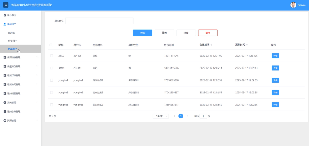 系统用户:管理员负责管理租客用户、房东用户等账号详情,通过输入房东姓名搜索,实现增删改查操作。
