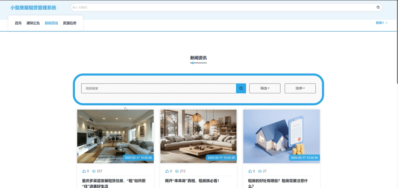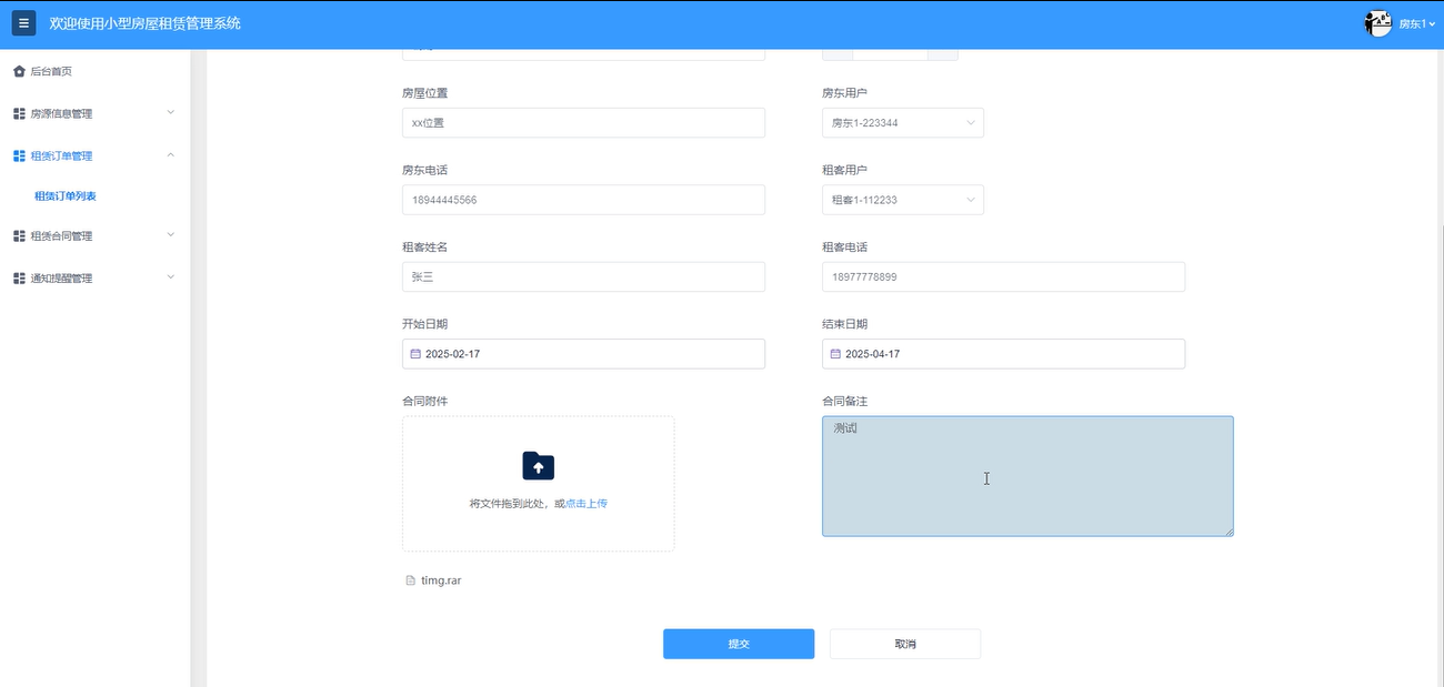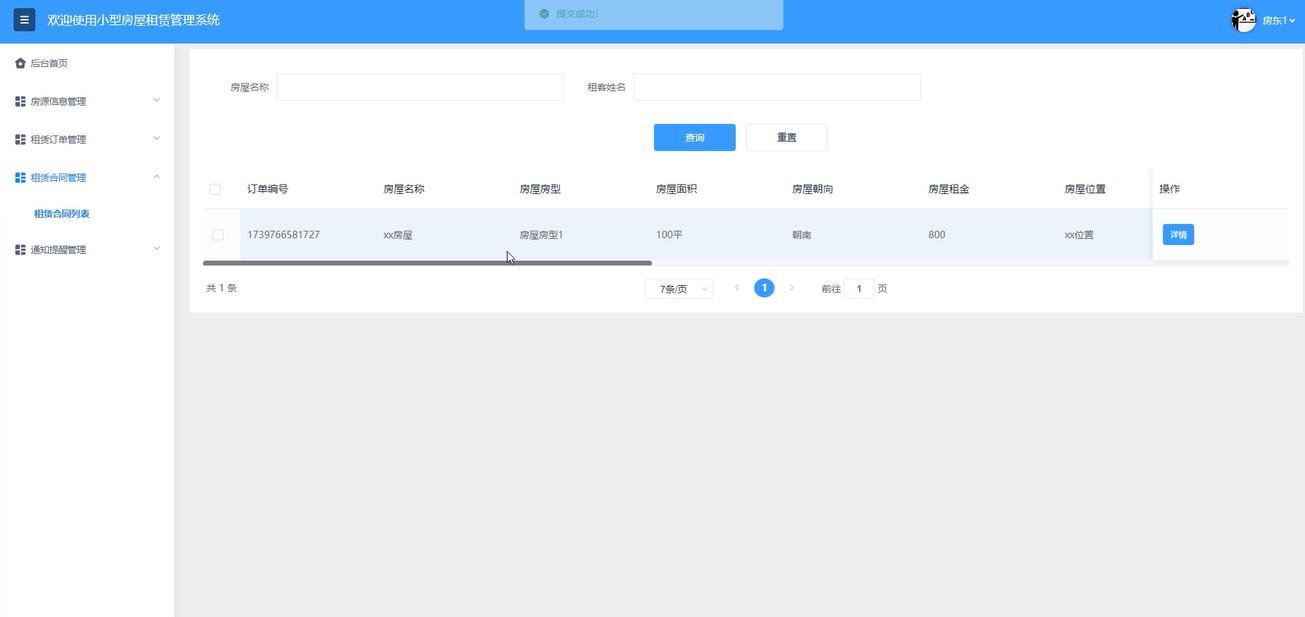 租赁合同管理:房东用户可以查看合同详情,通过输入房屋名称、租客姓名搜索查询,重置搜索条件。