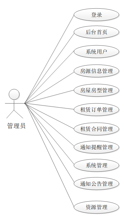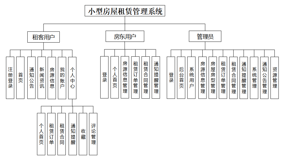按照房屋租赁管理系统的角色,主要划分为租客用户、房东用户和管理员这两大功能模块,各模块功能如下: