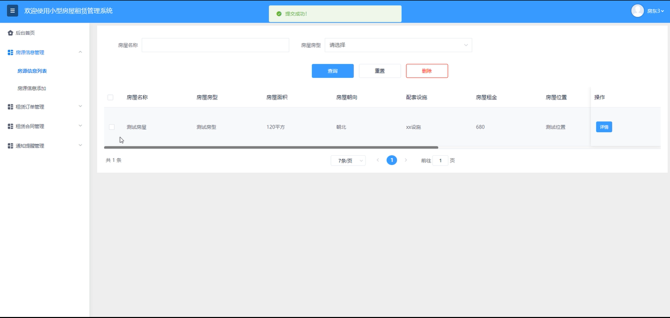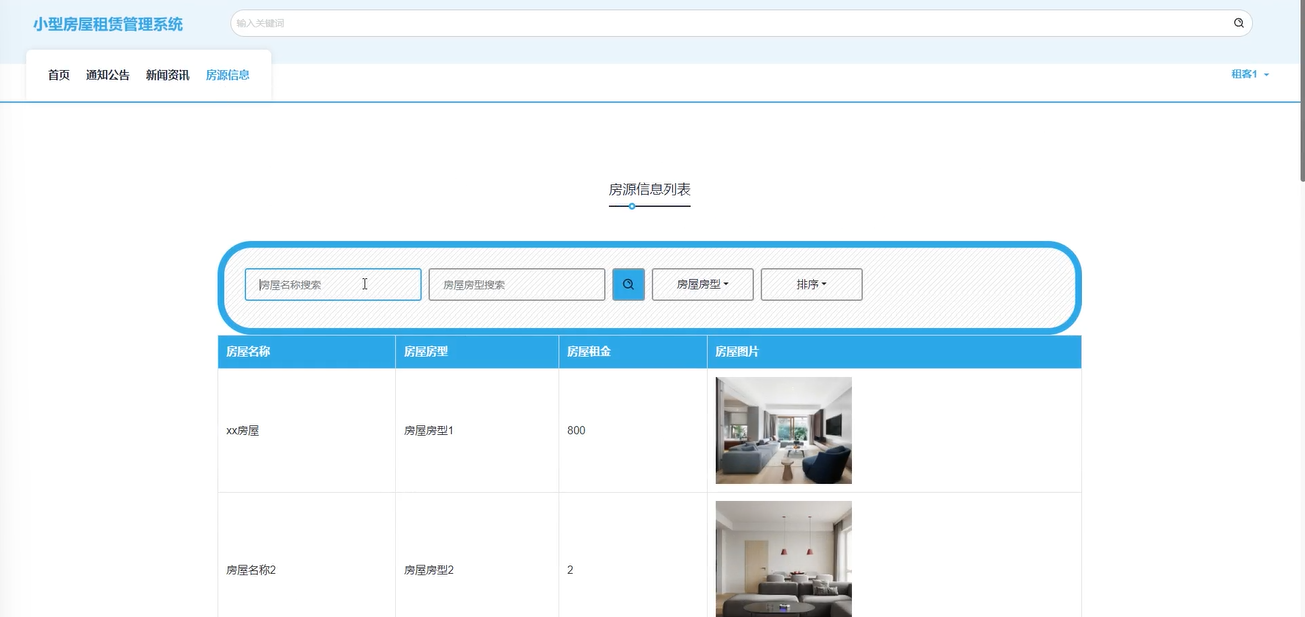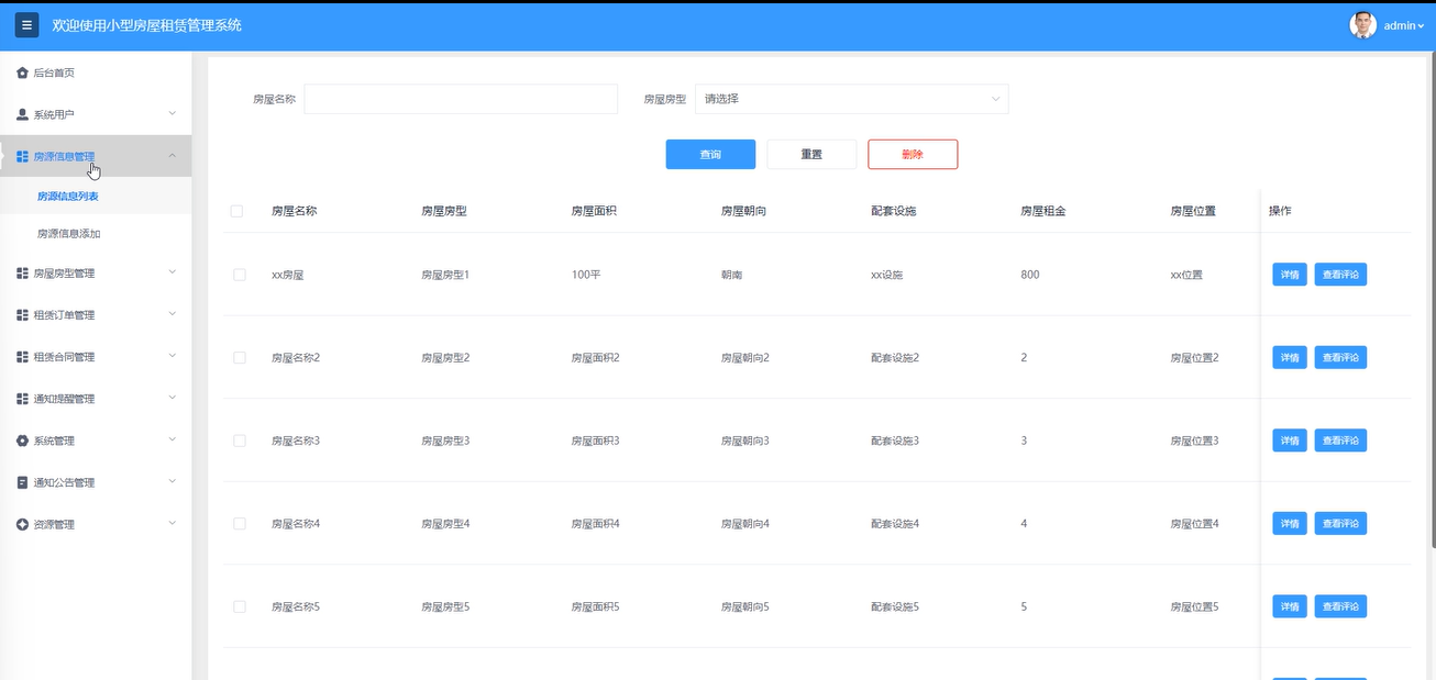 房源信息管理:管理员可以查看房源信息列表详情,通过输入房屋名称、选择房型进行搜索查询,重置搜索条件,添加新房源信息。