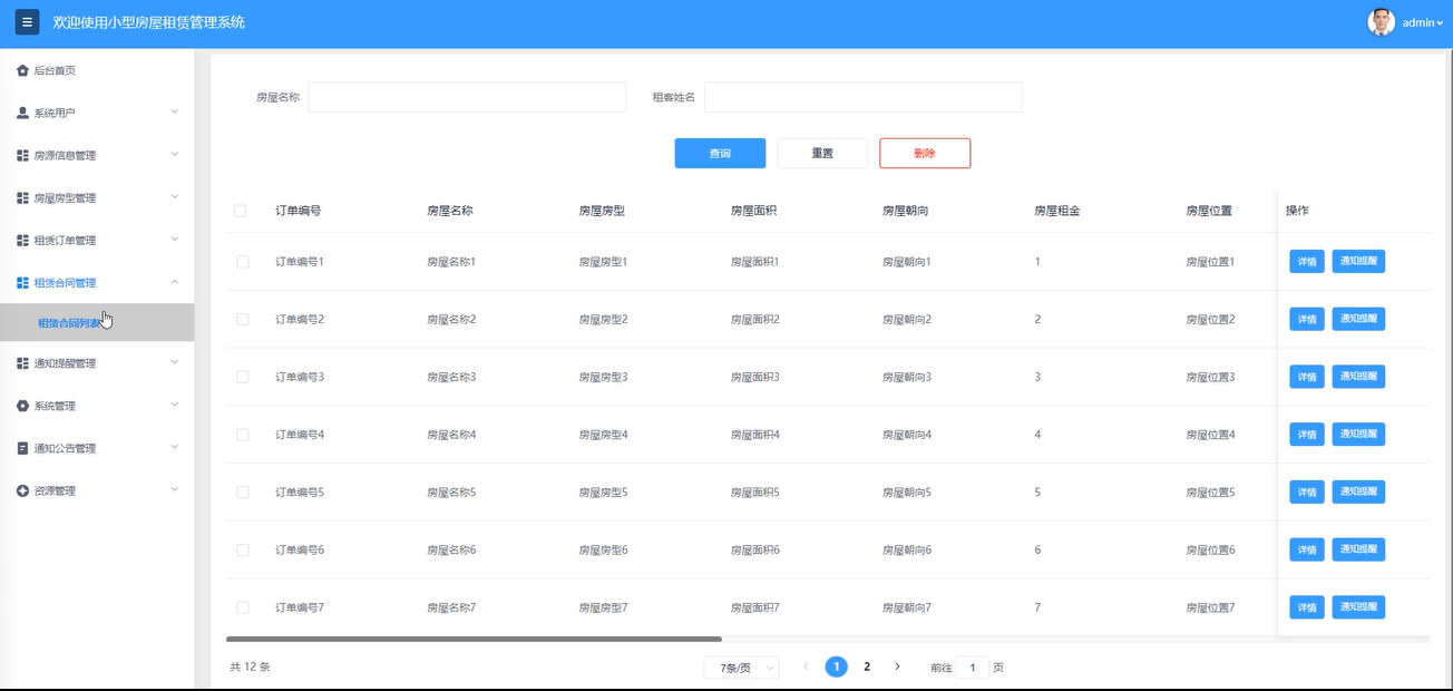 租赁合同管理:管理员可以查看合同详情并发送通知提醒,通过输入房屋名称、租客姓名搜索查询,重置搜索条件,删除合同。