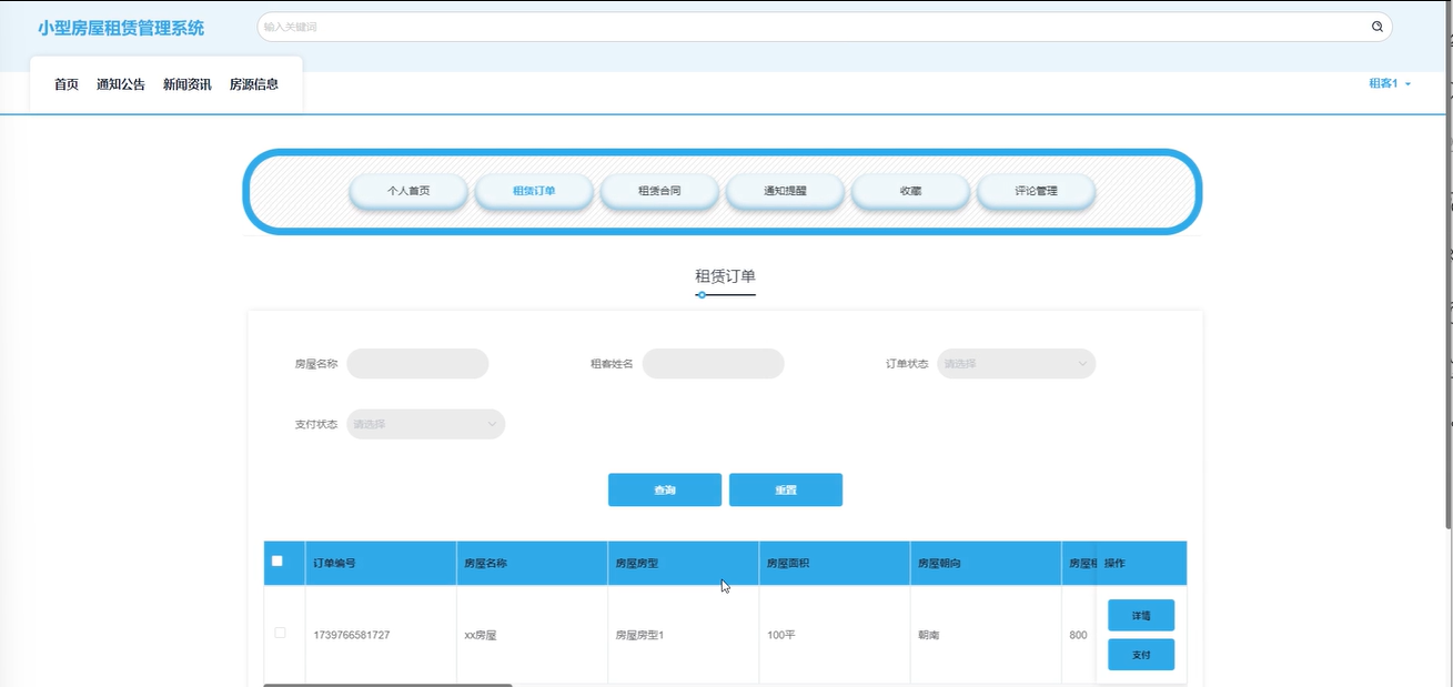 租赁订单:用户可以查看订单详情并进行支付,通过输入房屋名称、租客姓名等条件搜索查询,重置搜索条件。
