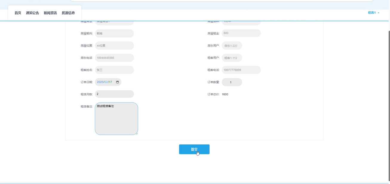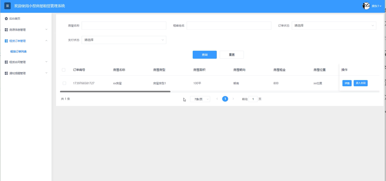 租赁订单管理:房东用户可以查看订单详情,通过输入房屋名称、租客姓名搜索查询,重置搜索条件。