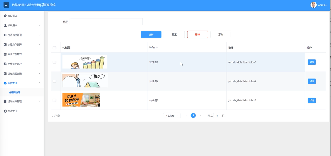 系统管理:管理员可以管理轮播图信息,通过输入标题搜索查询,增删改查操作,上传轮播图,输入标题和链接进行提交新增轮播图。