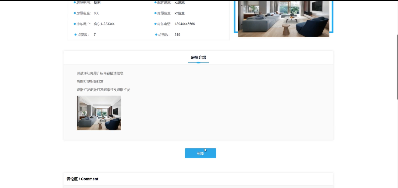 房源信息:用户可以查看详细的房源信息列表,包括房屋房型、面积、朝向和配套设施等。通过输入房屋名称、房型选择和排序搜索,找到心仪的房源。用户还可以对喜欢的房源进行点赞、收藏和评论回复删除,并进行租赁操作。