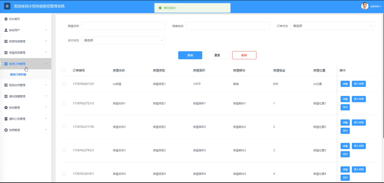 租赁订单管理:管理员可以查看订单详情并录入合同操作,通过输入房屋名称、租客姓名等条件搜索查询,重置搜索条件,删除订单。