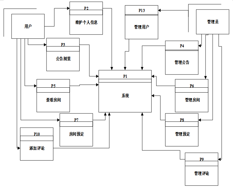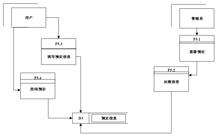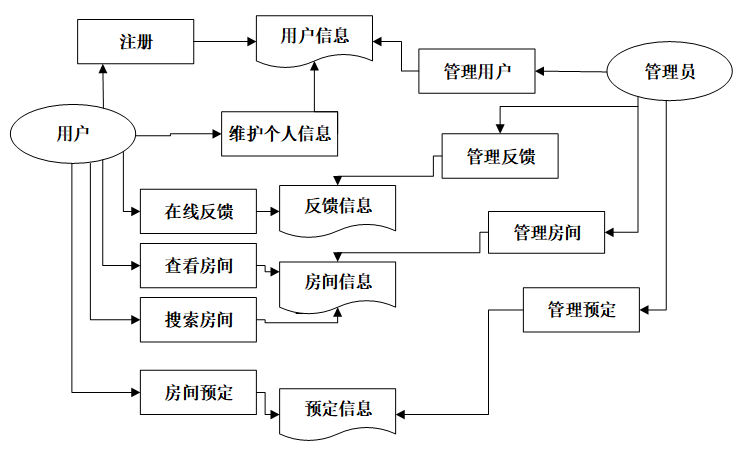 经过对系统功能的分析,调查,研究,总结出酒店预订系统主要实现的是对反馈信息、用户信息等管理功能。这样,可以对该系统绘制业务流程图。