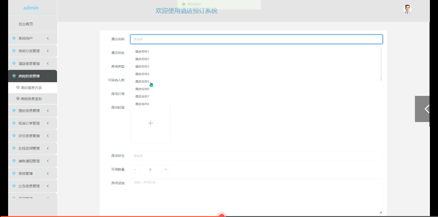 管理员可以添加新的房间信息,包括房间类型(标准间、豪华间、套房等)、房间价格、可容纳人数、房间设施等。