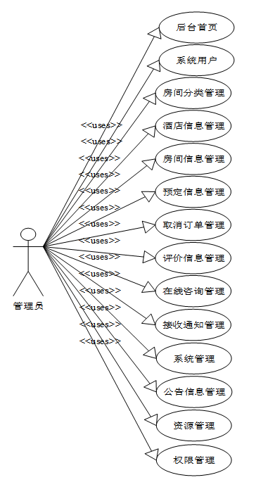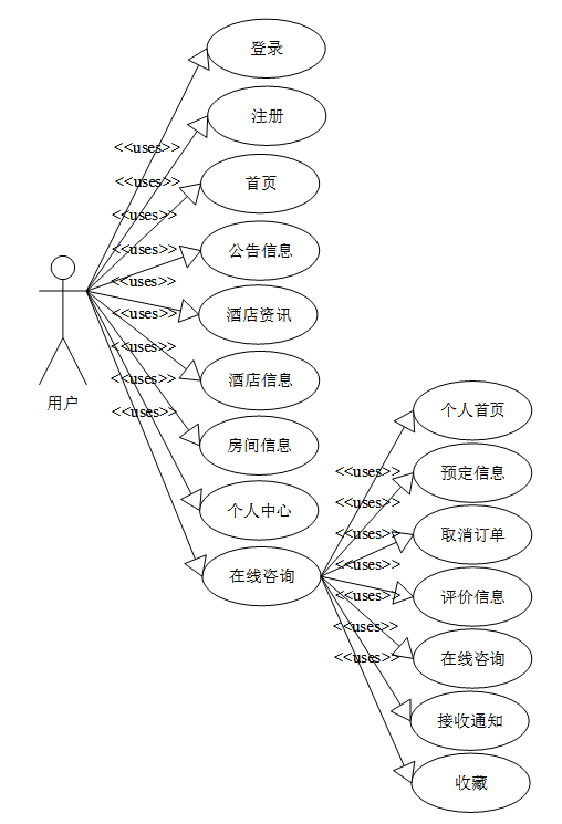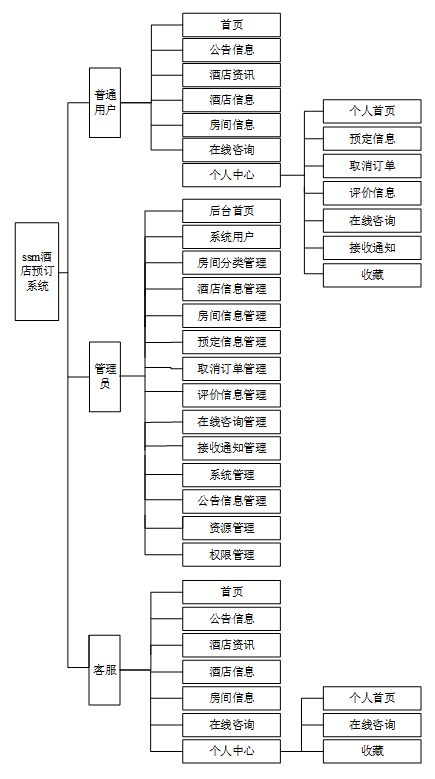 酒店预订系统的功能主要分为前台用户根据自己的需求进行注册登录,浏览房间信息并对需要的房间进行预订操作。后台系统管理员因职责的不同,主要对注册用户,房间分类管理、酒店信息管理、房间信息管理、预定信息管理、取消订单管理、评价信息管理、在线咨询管理、接收通知管理进行处理。
