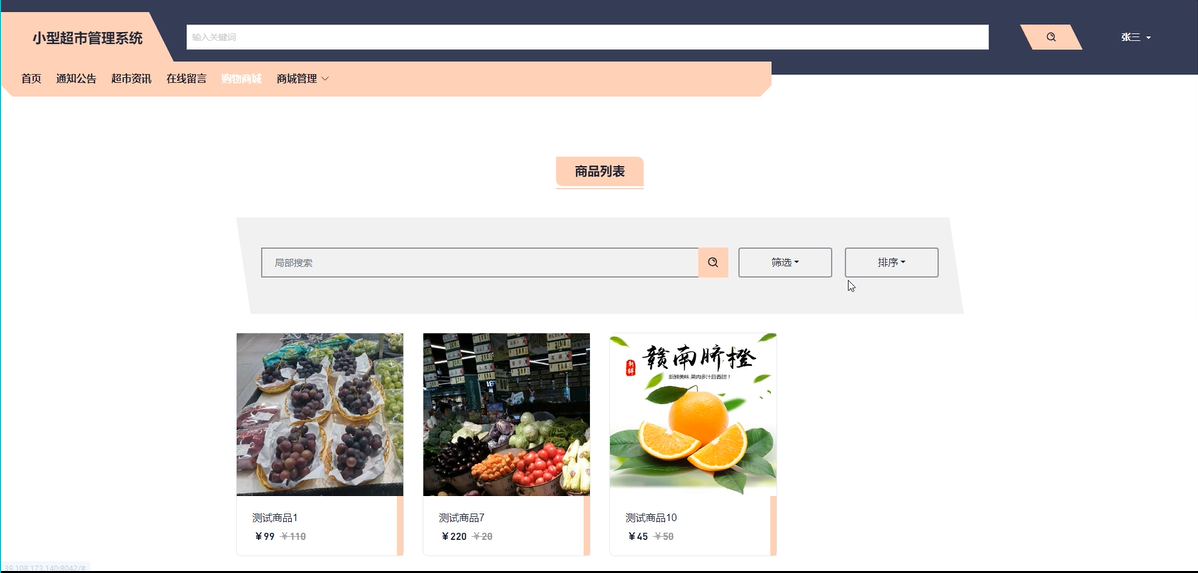 普通用户可以查看购物商场界面的商品列表,包括商品名称、价格、数量等,可以点击查看详情和进行评论等操作。界面如下图4.4所示。