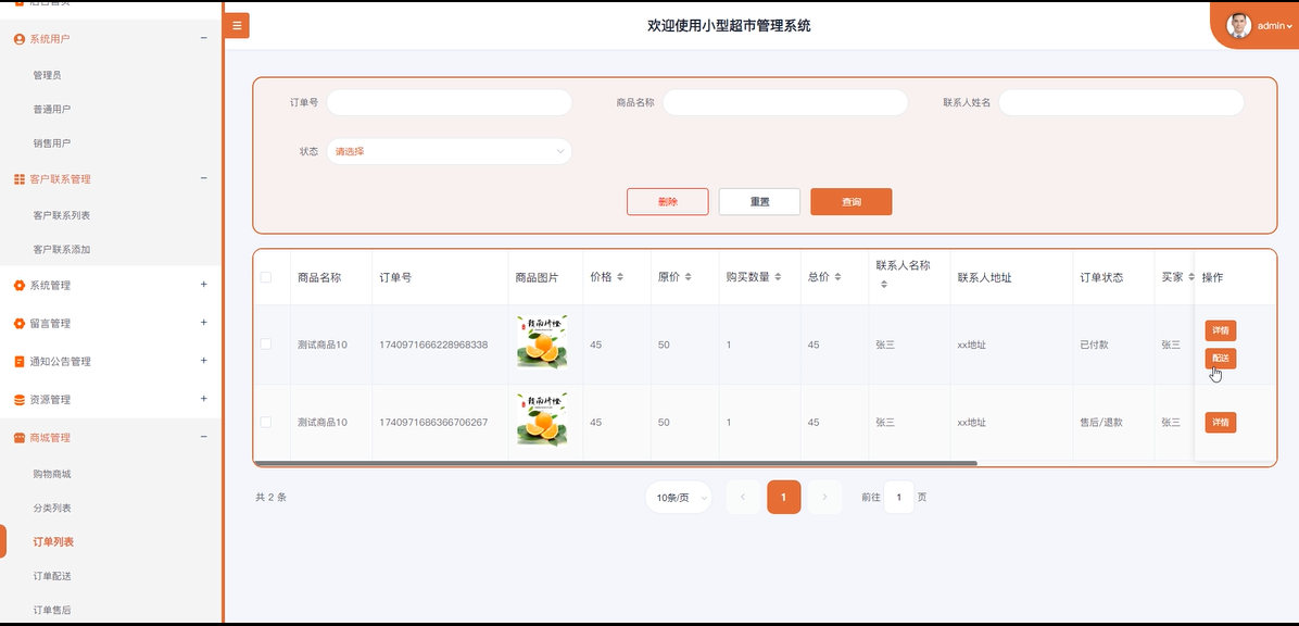 - 商城管理:管理员可以对购物商城、分类列表、订单列表、订单配送、订单售后进行管理。