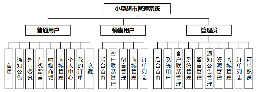 系统功能模块分成了管理员、普通用户、销售用户三个模块,每个模块登录进去对应相应的功能,具体的功能模块图如图3.1所示。