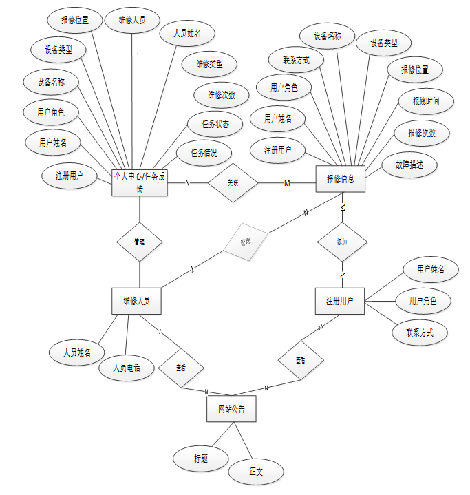下面是整个高校报修管理系统中主要的数据库表总E-R实体关系图。