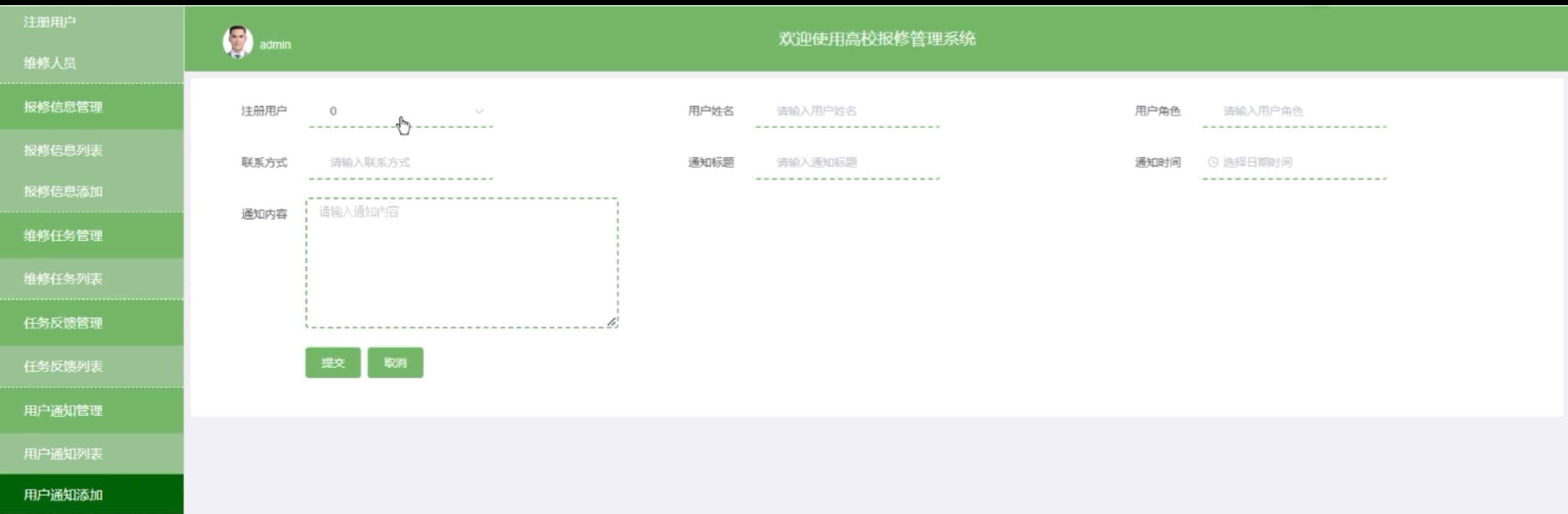 (7)用户通知管理:管理员点击可查看用户通知列表和用户通知添加;点击“用户通知添加”可填写相关信息,包括注册用户、用户姓名、用户角色、联系方式、通知标题、通知时间和通知内容。