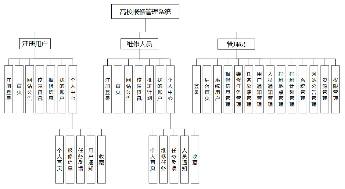 根据第二章中高校报修管理系统的功能分析可知,高校报修管理系统中整体功能模块图如图3-1所示,
