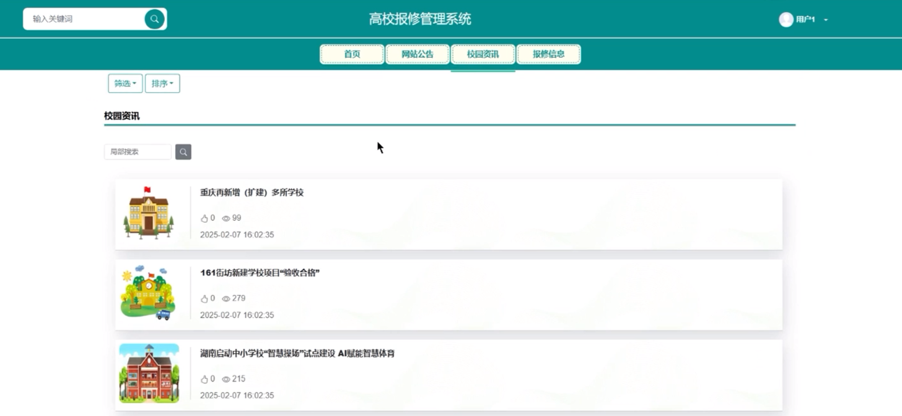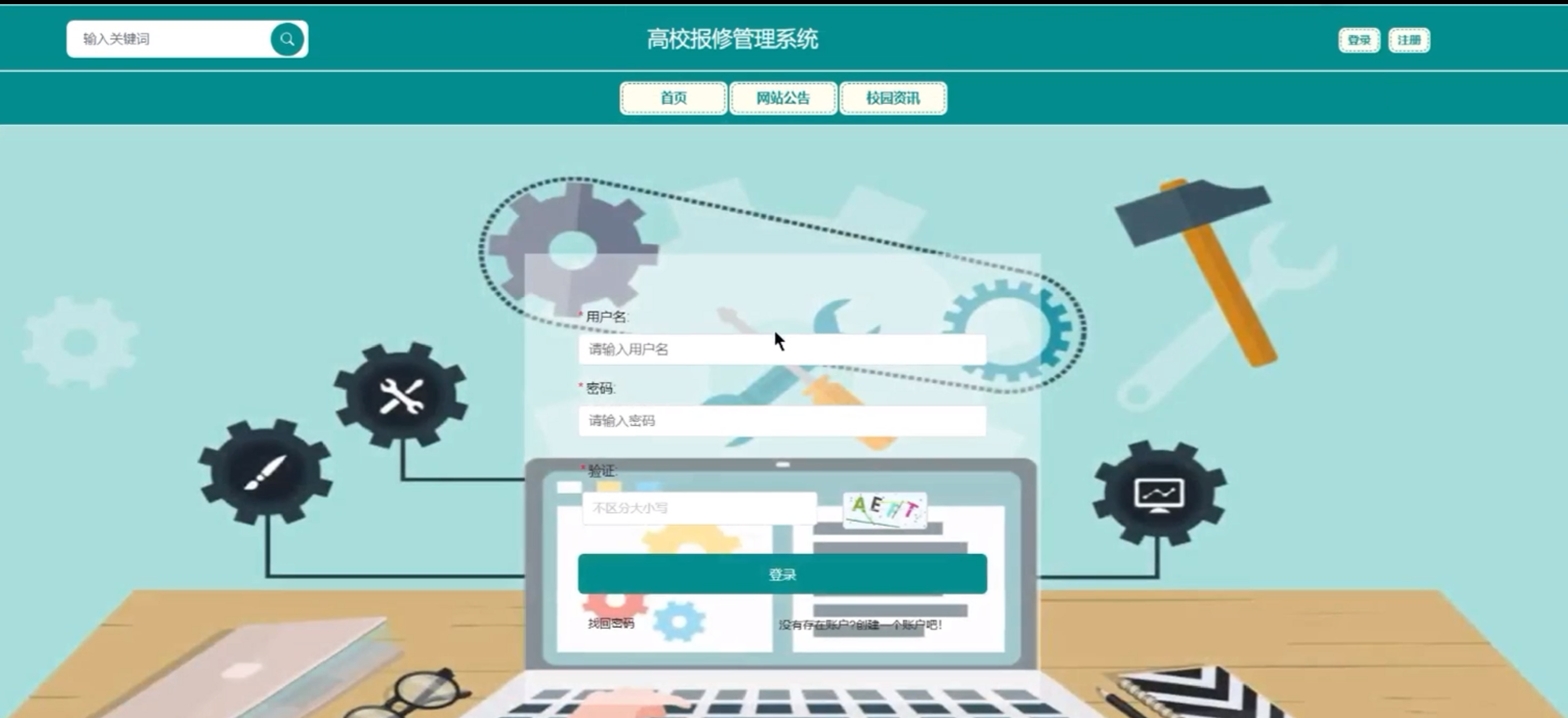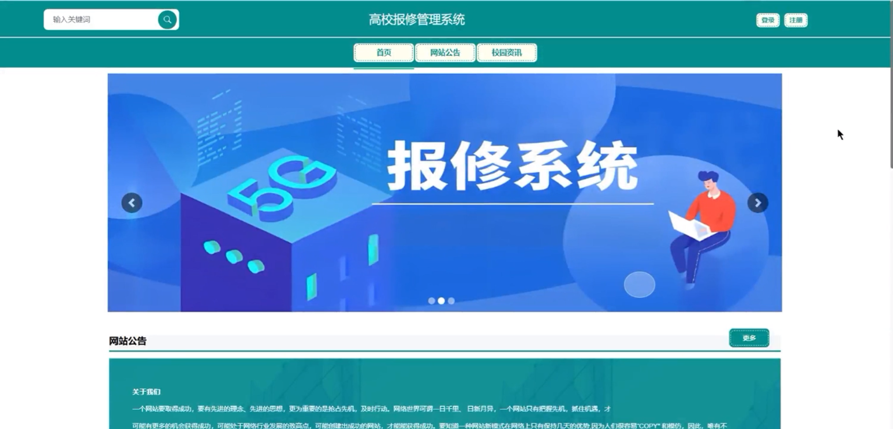 (2)首页:当用户进入高校报修管理系统的时候,首先映入眼帘的是系统首页、网站公告、校园资讯、报修信息等内容。