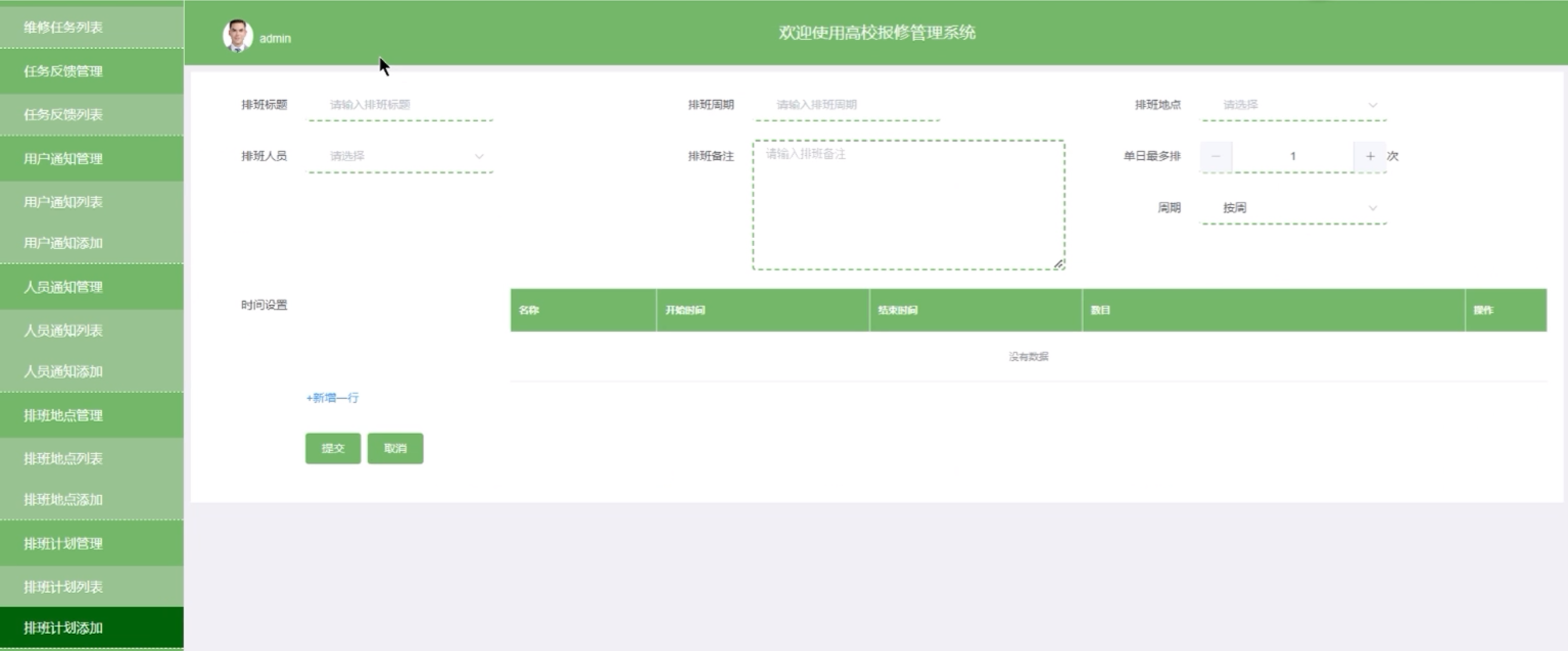 排班计划管理:管理员点击可查看排班计划列表和排班计划添加;点击“排班计划添加”可填写相关信息,包括排班标题、排班周期、排班地点、排班人员、排班备注、单日最多排、周期,时间设置。界面图如下。