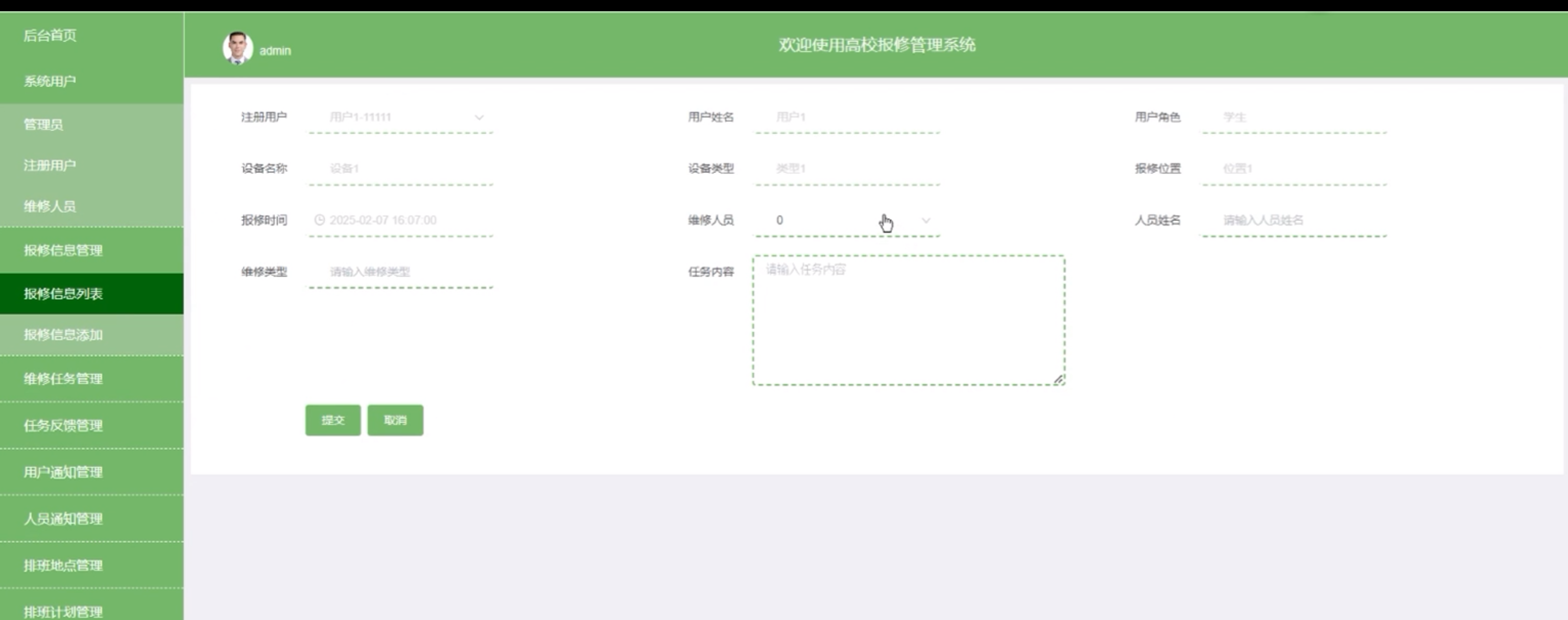 The college maintenance management system aims to improve the efficiency of campus logistics service by means of information technology, and meet the daily needs of teachers and students. The system has designed personalized function modules for different user groups, including student users, maintenance personnel and administrators. Student users can easily submit repair information through the system and track maintenance progress in real time. Maintenance personnel can view the scheduling plan and task details, and combine greedy algorithms to optimize task allocation to ensure efficient maintenance work. At the same time, the system also integrates functional modules such as announcements and information browsing, which not only facilitates users to obtain campus dynamics in time, but also enhances the interactivity and practicability of the system. The overall architecture takes user experience as the core, and realizes the closed-loop management of the whole process from repair to feedback.