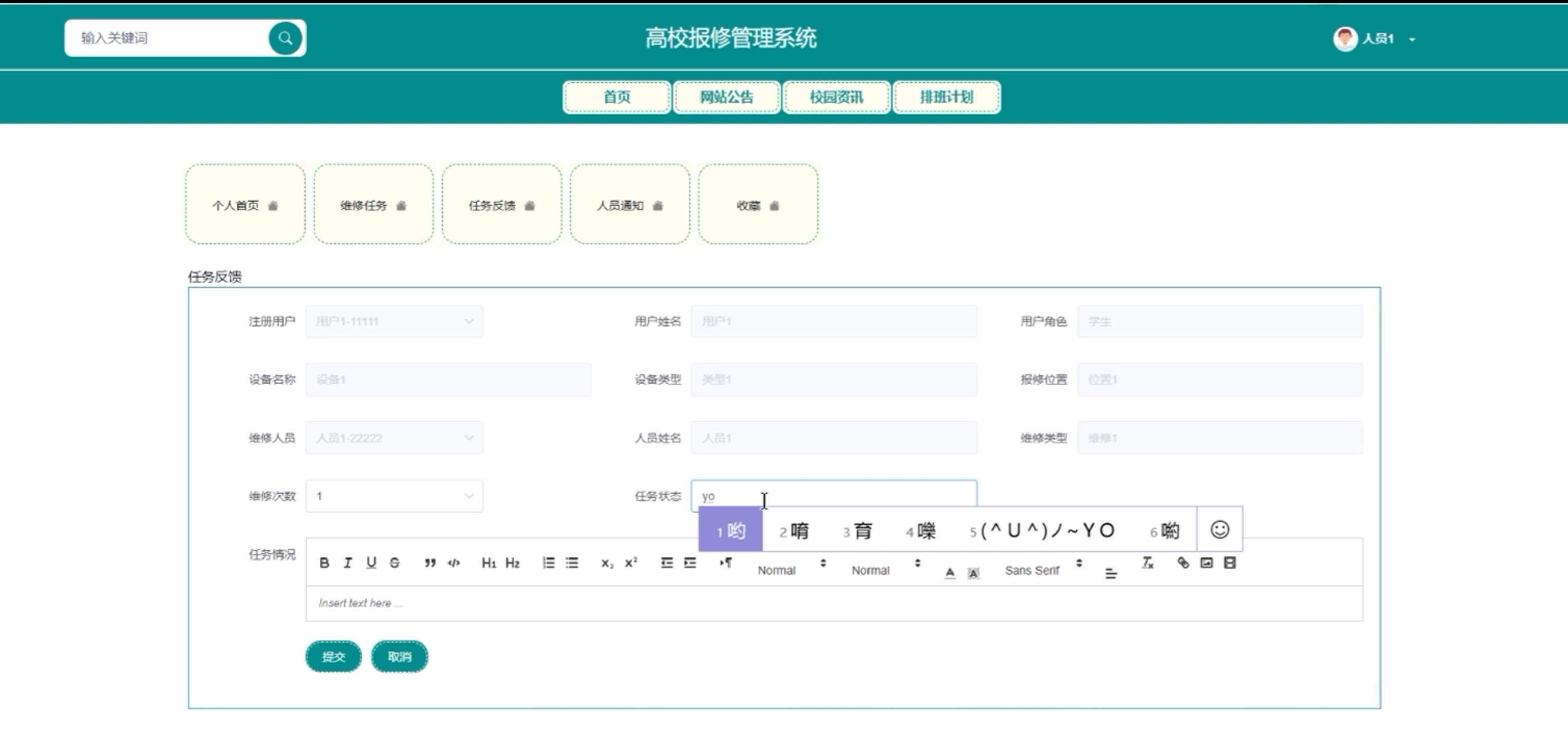 个人中心:个人中心包含多个功能模块,如个人首页、维修任务、任务反馈、人员通知和收藏。点击进入“维修任务”可查看任务详情,可点击“反馈”按钮填写反馈信息,包括维修次数、任务状态和任务情况。同时可点击相关功能进行查看和管理。界面图如下。
