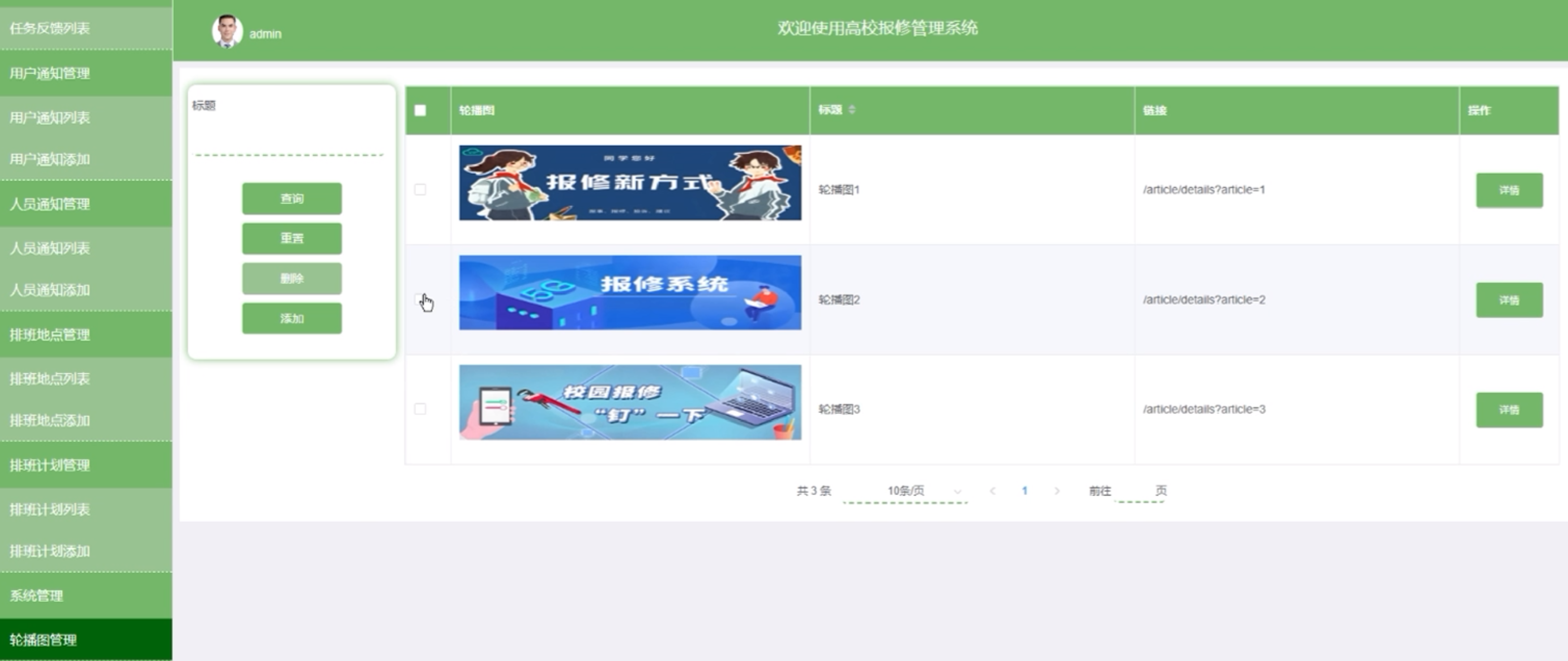 (11)系统管理:管理员点击可查看轮播图管理;如需添加新的轮播图,点击右侧“添加”按钮,上传图片,输入标题和链接,点击“确认”按钮进行添加;同时可对轮播图进行增删改查。