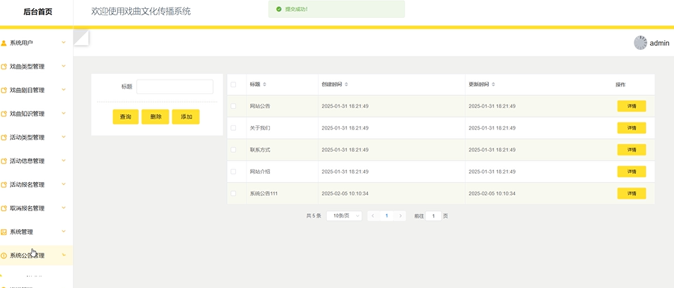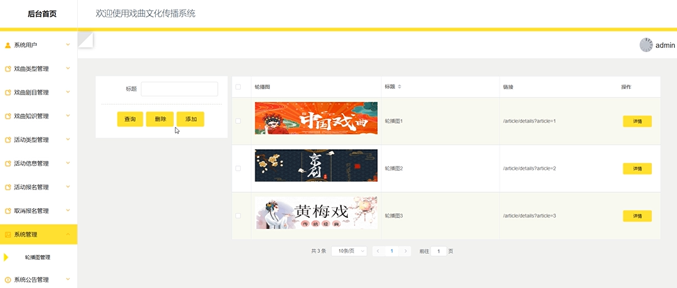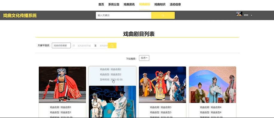 The system not only realizes the basic functions of user registration and login, drama drama display, opera information release and opera knowledge popularization, but also innovatively introduces the activity information management module to facilitate users to sign up for various opera activities and have face-to-face communication and interaction with opera artists and opera lovers.