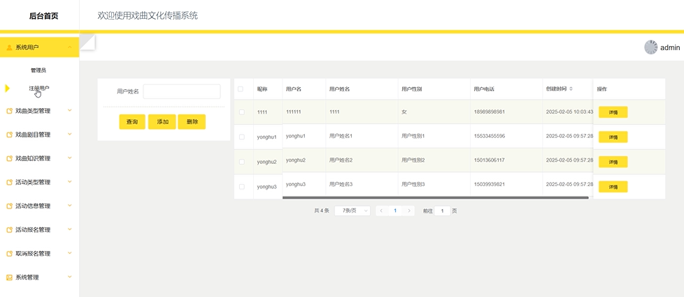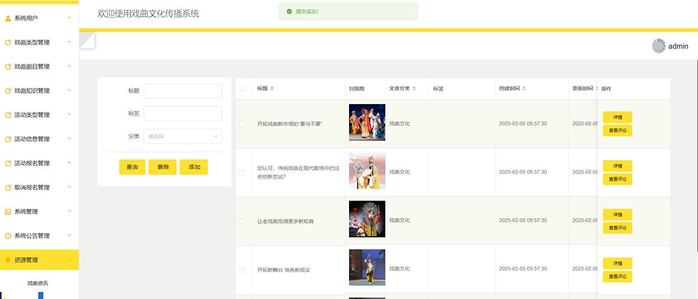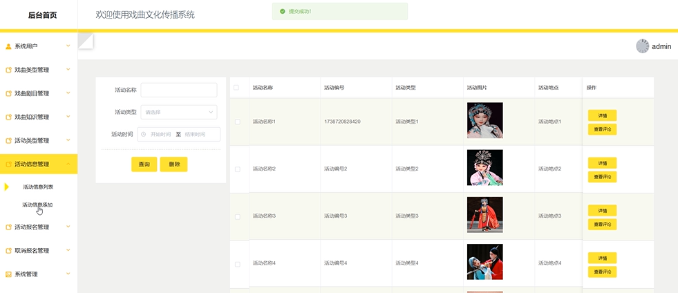该系统不仅实现了用户注册登录、戏曲剧目展示、戏曲资讯发布、戏曲知识普及等基础功能,还创新性地引入了活动信息管理模块,方便用户报名参加各类戏曲活动,与戏曲艺术家和戏曲爱好者进行面对面的交流互动。