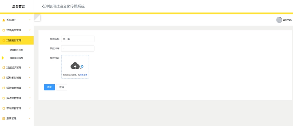 第五章:系统实现,主要介绍了戏曲文化传播系统各个注册用户的功能、系统界面的实现。