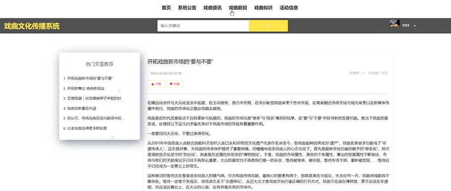 In the process of system design and implementation, the system adopts the advanced front and rear end separation development mode. In the front end, Vue.js, a popular JavaScript framework, is selected to create a responsive and friendly user interaction experience. Through a simple and clear interface, users can easily browse drama plays, read drama information, learn drama knowledge, and easily participate in various drama activities.