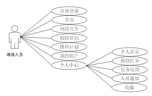 (3)确定好系统使用的技术,进行在线确认系统所划分的用户触,并且根据用户触划分确定所要设计的功能模块,对高校报修管理系统的设计主要划分别为管理员、注册用户和维修人员,并所使用的功能模块也相应不同,但系统的数据库实现的内容是交互的,用户可以随时根据自己的需求进行报修信息填写上报,对于系统工作人员可以根据自己的分管内容进行在线信息的处理及操作,管理员获取到所有用户的详细数据信息,并根据需求进行第一时间处理解决。